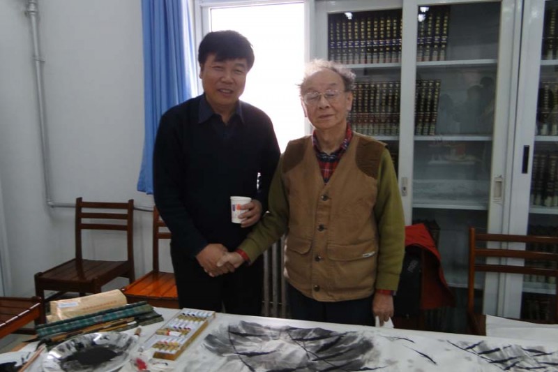 著名画家吴休老先生在清华附中建校95周年书画大师笔汇现场与书法家张少周先生合影留念